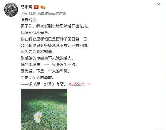 在讀《第一爐香》有感中,馬思純曾寫道:“張愛玲的卑微換不來她的愛人……因為愛,不是一個人的卑微,而是兩個人的勇敢。”
