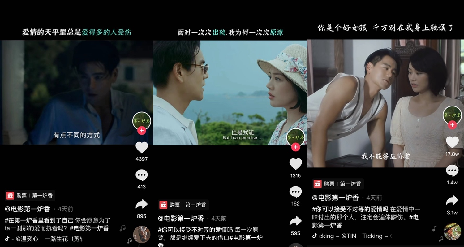 這點招致了很多爭議。尤其該片在前期宣傳中,更是在短視頻平臺套用了一些愛情電影的營銷套路,譬如“渣男慣用套路”“花花公子慣用話術”“在第一爐香中看到了自己”“給愛而不得一個告別日”等等,突出電影中的愛情元素。