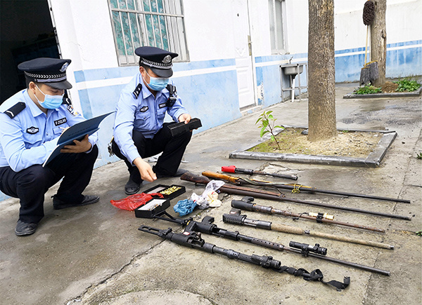 襄陽市保康縣公安局民警正在查驗收繳的槍支彈藥。