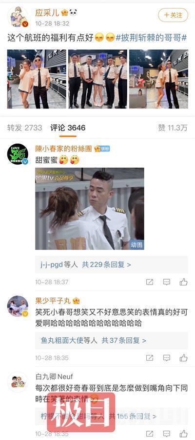 極目新聞記者留意到,應(yīng)采兒早在28日下午6:32就放出了秀恩愛的微博,圖片里,陳小春、張智霖、張晉等都穿上了機長制服,應(yīng)采兒還大方對老公獻吻。對于這樣愛秀恩愛的嫂子,粉絲竟然還搶在前排“吃糖”,應(yīng)采兒這條微博下,被頂?shù)阶罡叩氖恰瓣愋〈杭业姆劢z團”,粉絲們貼心留言“甜蜜蜜”,“好自然又甜蜜的親親抱抱,太甜了!”(部分圖片來自芒果TV微博)