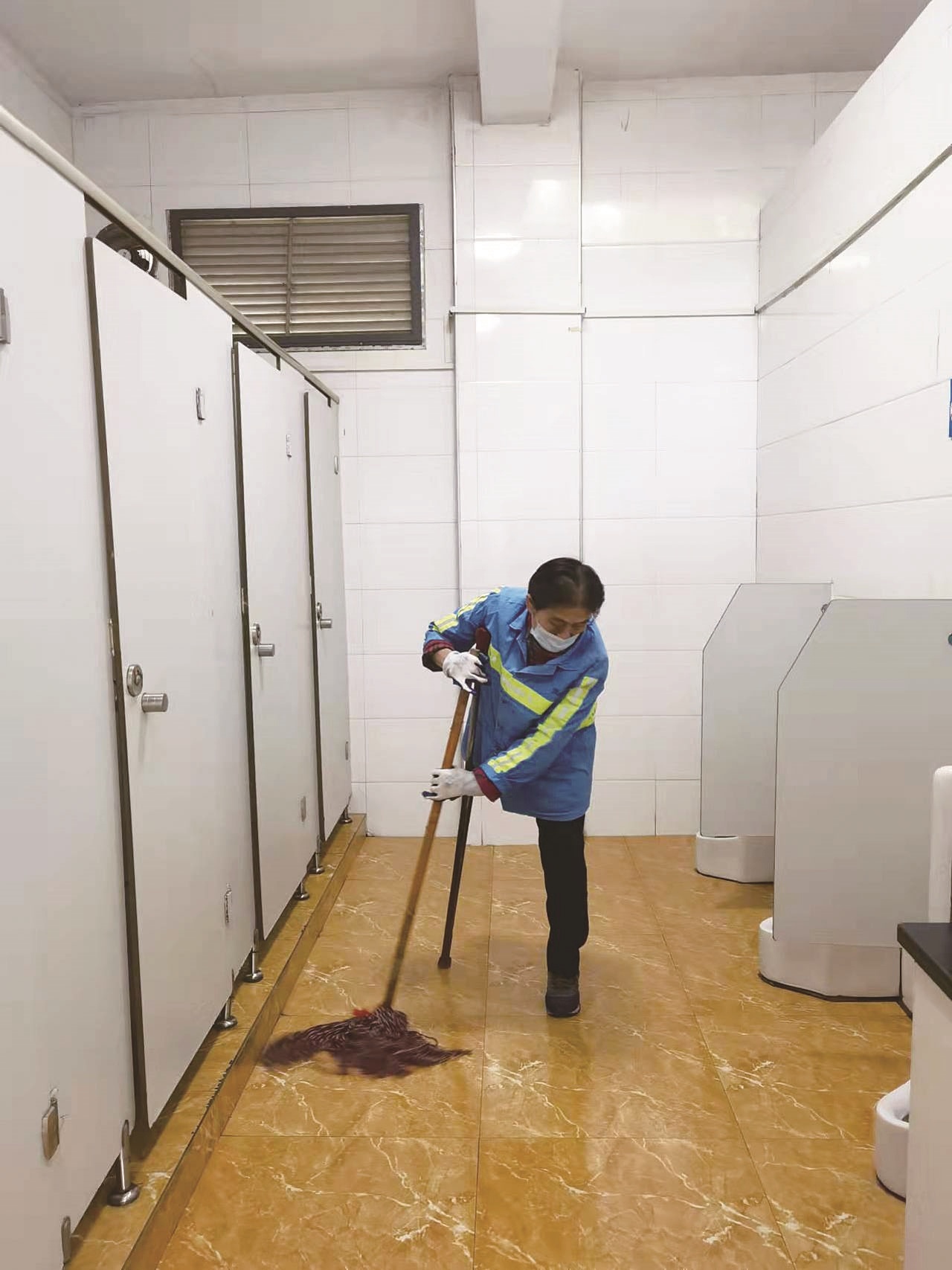 為了避免老人滑倒摔跤,她會仔細擦干地面水漬,下雨天還會事先墊上防滑墊。如果見到有人破壞設施設備,她會立即制止。即便沒有人如廁,她也會每隔半個小時清掃一遍廁所,保持公廁清潔。