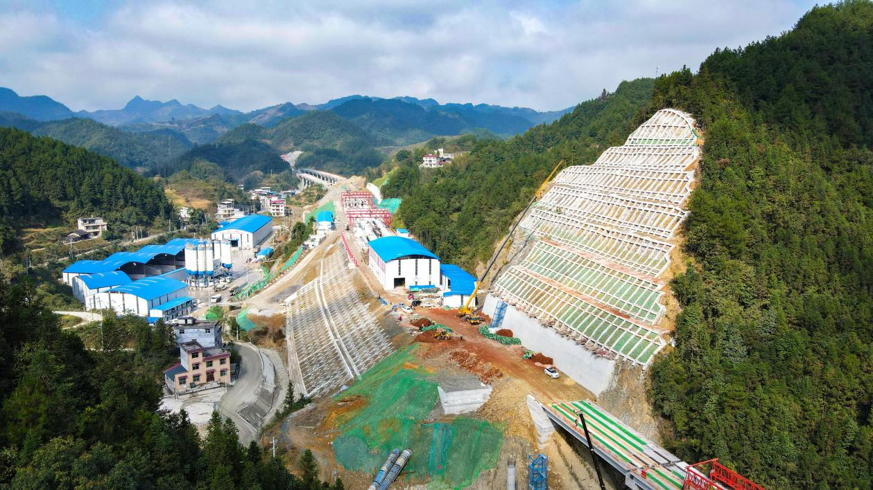 來鳳縣翔鳳鎮老茶村,僅一條曲折的鄉間公路與外界相連,宣咸高速施工打破了山溝往日的寧靜。宣咸高速旁八級邊坡依山而筑,矩形的混凝土框格整齊布列,高聳的吊車起起落落,身穿橘紅安全馬甲的工人們正在忙碌地往框格內填充布滿草籽的土袋,開春將是一片青草萋萋。