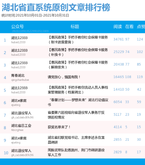 10月原創(chuàng)文章前十中,四篇來自“湖北12333”,“湖北e家庭”“湖北退役軍人”均有兩篇,“青春湖北”“湖北省總工會”各有一篇。從文章內容來看,惠民政策及領導動態(tài)較受網(wǎng)友青睞。“湖北12333”關于社會保障卡制卡進度查詢、補換卡、解除掛失的操作教學因與公眾密切相關,且流程簡潔明了,包攬榜單前三,流動人員人事檔案管理服務也位居前五。此外,“湖北退役軍人”所發(fā)布的《省委第六巡視組向省退役軍人事務廳反饋巡視情況》《周振武帶隊赴恩施州、荊門市調研退役軍人工作》以及“湖北e家庭”發(fā)布的《湖北省婦聯(lián)黨組書記、主席李述永在宜昌調研》關注度較高。