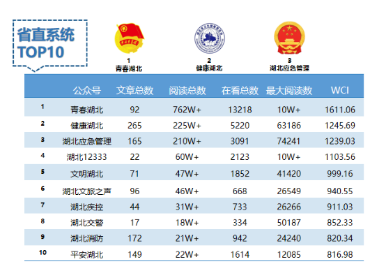 10月,WCI指數(shù)排名前三的是“青春湖北”“健康湖北”和“湖北應急管理”。“湖北消防”自7月以來,時隔兩月再次沖入前十。從近幾個月的入榜名單來看,8-10名競爭較為激烈,出現(xiàn)頻繁變動,不乏有新面孔因當月表現(xiàn)優(yōu)異成功入榜。
