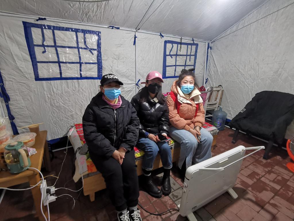 曹雪(右一)、袁佳燕(右二)在剛搭建好的厚帳篷中值守。新華社記者許晉豫 攝