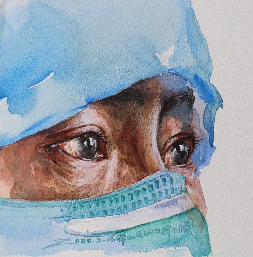 王永晟說(shuō),最初將畫(huà)集命名為“最美天使”,是因?yàn)殡x病毒最近的就是醫(yī)護(hù)人員,他們?cè)趹?zhàn)疫前線,連續(xù)多日與病毒艱難較量、與死神頑強(qiáng)抗?fàn)帯I缃幻襟w上,布滿血絲的雙眼、被防護(hù)服捂出的皮膚褶皺、被口罩勒出的印痕……這些給了他靈感,由此他特意創(chuàng)作了《帶血絲的雙眸》。