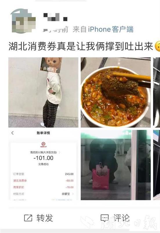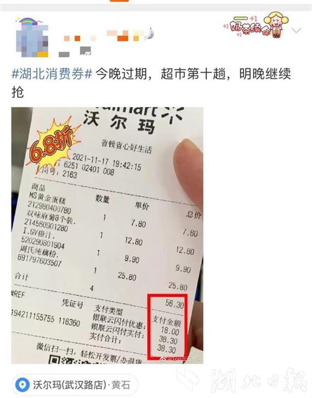 11月17日是上一批湖北消費(fèi)券有效期的最后一天。當(dāng)晚,有不少微博網(wǎng)友曬出卡點(diǎn)消費(fèi)的賬單,“68折”“吃到撐”的湖北消費(fèi)券讓大家直呼“真香”,還有的已經(jīng)擺好姿勢(shì)準(zhǔn)備開搶。