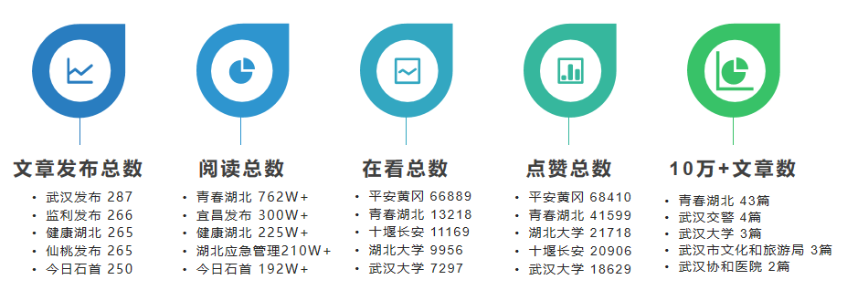 從文章閱讀總數來看,前五名中,除“青春湖北”閱讀數上升外,其余四個賬號閱讀數均呈現下降態勢,其中“今日石首”以略微優勢超過“武漢大學”,位居該項指數第五位。“青春湖北”閱讀總數762萬+(上期672萬+)、“宜昌發布”閱讀總數300萬+(上期351萬)、“健康湖北”225萬+(上期259萬+)、“湖北應急管理”閱讀總數210萬+(上期224萬+)、今日石首閱讀總數192萬+。
