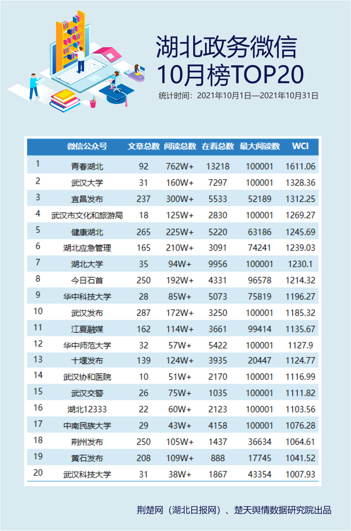 10月WCI指數前二十榜單中,前三名與上期一致,由“青春湖北”“武漢大學”“宜昌發布”奪得。總體來看,前三甲在發文總數、閱讀總數、在看總數、點贊總數、10萬+文章數、WCI指數等各項指標中,表現均可圈可點。值得一提的是,“青春湖北”“武漢大學”誕生多篇10萬+優質文章。