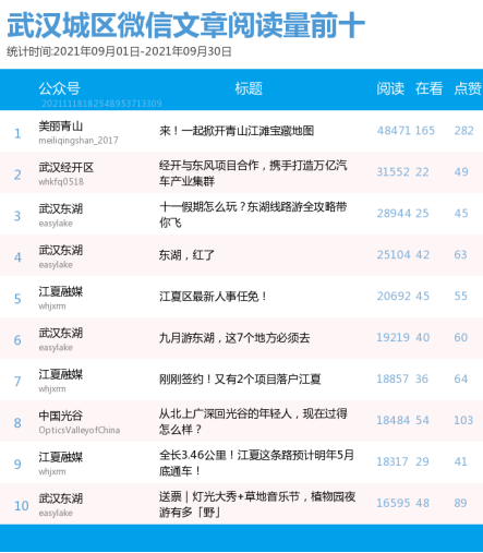 本期微信文章閱讀量前十榜中,“武漢東湖”共4篇文章上榜,“江夏融媒”占據3席,“美麗青山”“武漢經開區”“中國光谷”分別各1篇。閱讀量排名第一的文章出自“美麗青山”,名為《來!一起掀開青山江灘寶藏地圖》,其運用H5互動長圖的形式,徐徐展現青山江灘公園美景。此外,文中圖片精美,文風活潑,閱讀起來舒適愉悅。網友紛紛點贊留言“青山未來可期”“金山銀山比不過青山”“青山江灘處處是美景”。此外,“武漢東湖”4篇文章主要聚焦東湖景區宣傳,景點本身就具有較高流量,加上旅游攻略、送票活動加持,因此閱讀量可觀。“江夏融媒”3篇上榜文章主要內容涉及人事任免、項目落戶、交通建設,都是與本地發展相關的內容,因此也獲得了較高關注度。“武漢經開區”則聚焦經開區與東風公司的項目合作,本次戰略合作將為經開區二次創業提供強大動力,助力打造萬億汽車產業集群,意義非凡。“中國光谷”重點關注從北上廣深回光谷的年輕人,用自述的形式,展現光谷青年積極向上的生活狀態,引發眾多讀者共鳴。