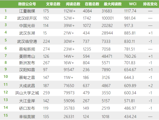 與上期相比,除前三甲、第六名“蔡甸新聞”、第十五名“幸福黃陂”排名未變化外,其他皆有小范圍變動。“武漢東湖”和“武漢臨空港”排名對調,本期分別位列第四、第五;“美麗青山”和“新洲發布”排名對調,分別位列第七、第八;同樣“漢陽知音”與“蔡甸之音”對調,分別位列第九、第十。此外,其余各家均有1-2位的小幅度波動。9月上榜前十五名賬號WCI得分均有所下降,上榜尾部得分從上期的580降至430區間。