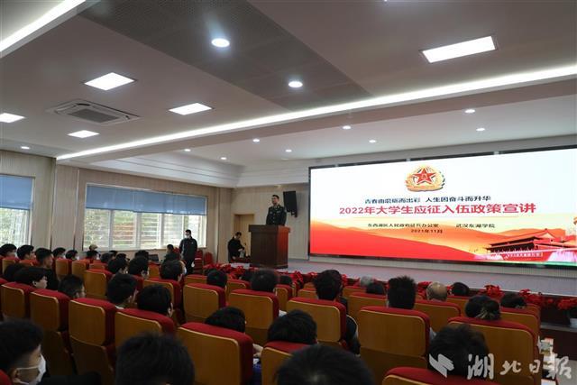 東西湖區人武部部長王樹人、副部長曾躍飛為大學生詳細解讀征兵條件和相關政策,如大學生應征入伍可享有的優先考學提拔、學費補償和國家助學貸款代償、退役后享受就學就業等優撫政策。