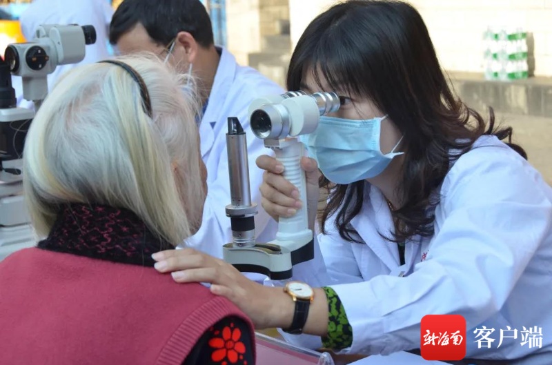 海南省眼科醫院醫生進社區,為社區居民檢查眼病。醫院提供