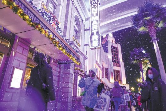 環(huán)球度假區(qū)冬季特色景觀近日開啟,夜色里的好萊塢景區(qū)流光溢彩。本報(bào)記者 武亦彬攝
