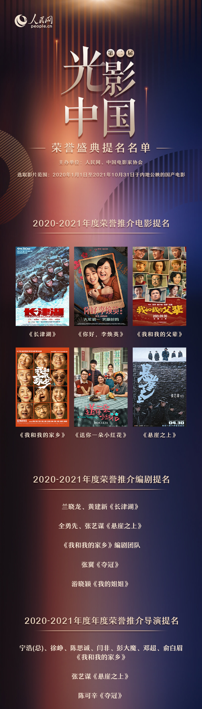 人民網(wǎng)北京12月8日電 (劉穎穎、郭冠華、劉微)近年來(lái),我國(guó)電影發(fā)展取得豐碩成果,涌現(xiàn)了一批叫好又叫座的優(yōu)秀作品。為在新的歷史起點(diǎn)上進(jìn)一步推動(dòng)中國(guó)電影高質(zhì)量發(fā)展,助力電影強(qiáng)國(guó)建設(shè),由人民網(wǎng)、中國(guó)電影家協(xié)會(huì)聯(lián)合主辦的第二屆“光影中國(guó)”榮譽(yù)盛典將于2021年12月20日在北京舉辦。