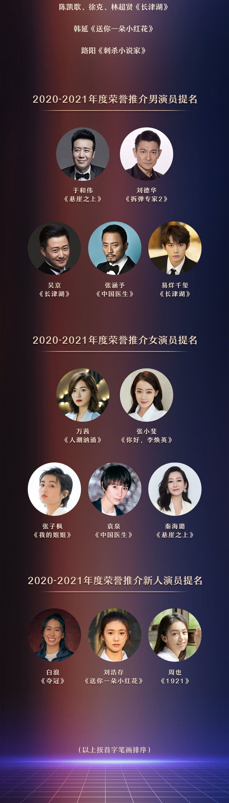 本屆盛典選取影片范圍為2020年1月1日至2021年10月31日于內(nèi)地公映的國(guó)產(chǎn)電影,綜合國(guó)家電影專(zhuān)資辦票房數(shù)據(jù)(截至2021年11月16日)和多平臺(tái)口碑評(píng)分,排在前30位的作為初選電影名單。主辦方組織推介委員會(huì),按照政治性、藝術(shù)性、社會(huì)反映和市場(chǎng)認(rèn)可四大維度,經(jīng)過(guò)討論和初評(píng),確定各推介項(xiàng)目提名名單。推介委員會(huì)對(duì)提名名單進(jìn)行復(fù)審和終評(píng),最終結(jié)果將在盛典當(dāng)日揭曉。
