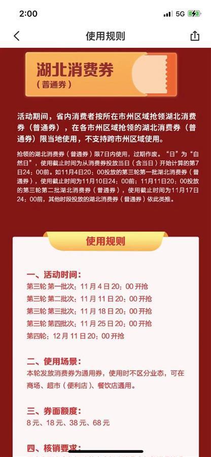本輪湖北消費券普通券的有效期仍為發券首日起的7個自然日內,如12月11日20:00開始發放的第三輪首批消費券,用券截止時間為12月17日24:00。