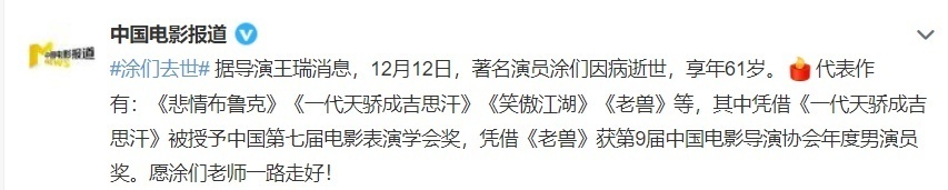 據@中國電影報道,12月12日,著名演員涂們因病逝世,享年61歲。