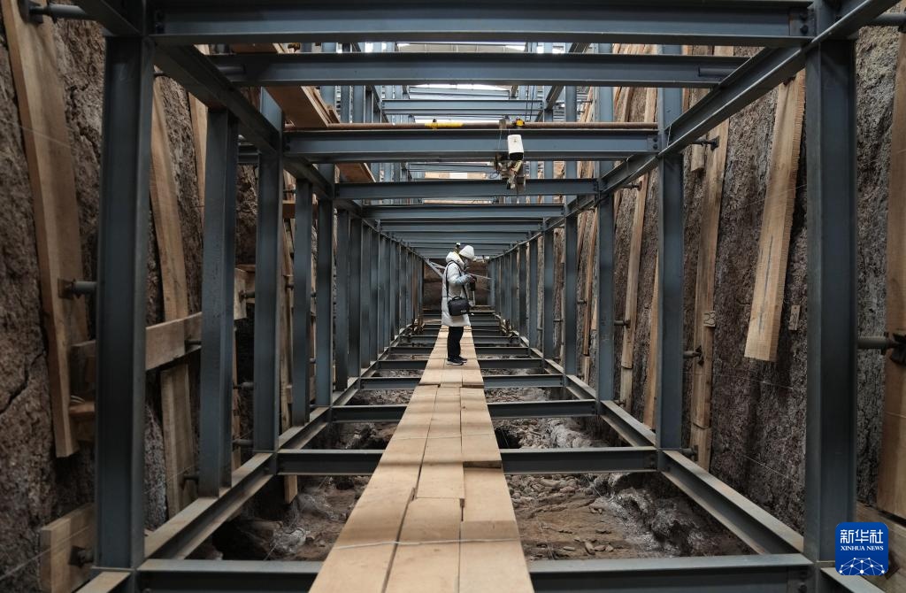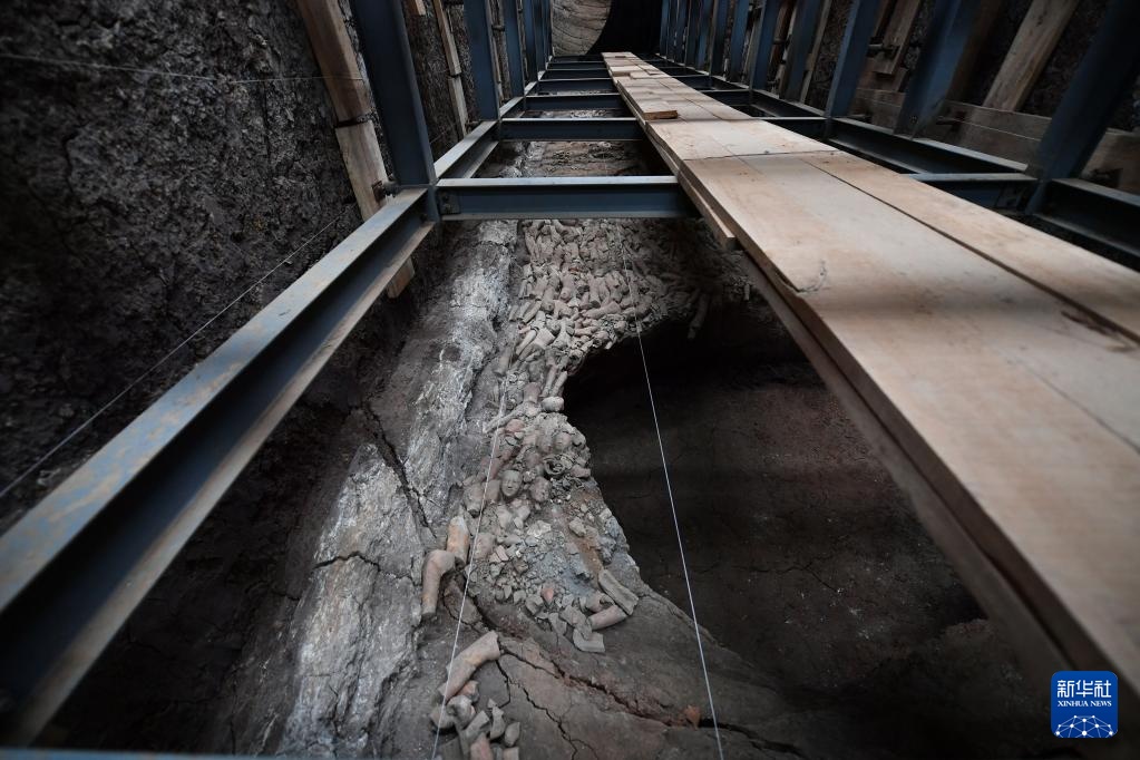 12月16日,媒體記者在江村大墓外藏坑內采訪拍攝。