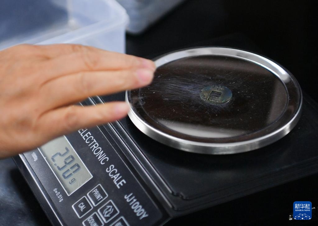 12月16日,工作人員對江村大墓出土的銅錢進行稱重。