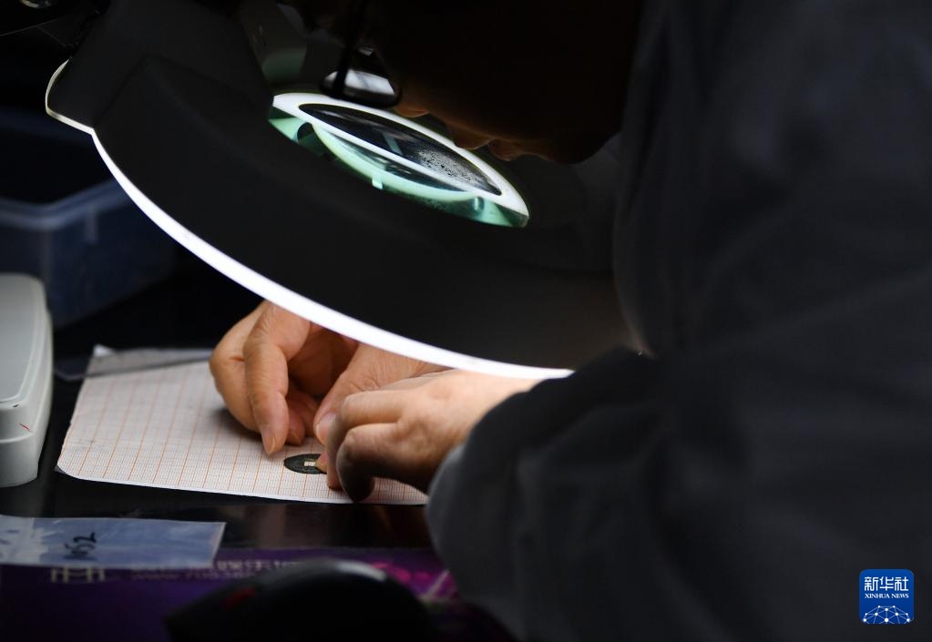 12月16日,工作人員查看江村大墓出土的銅錢。