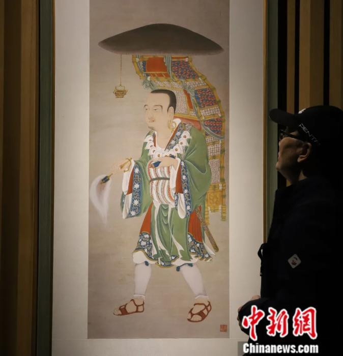 2019年11月,北京,參觀者在“即心即佛——姜雪雁佛菩薩圣像畫展”上參觀《玄奘負(fù)笈取經(jīng)圖》。中新社發(fā) 郭海鵬 攝