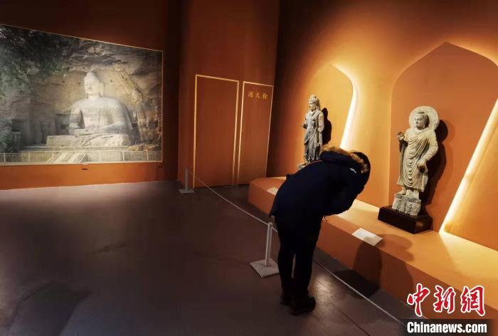 開鑿于北魏時(shí)期的山西云岡石窟是犍陀羅佛教藝術(shù)的代表之一,而在本次的展覽中,來自古犍陀羅地區(qū)的佛教雕像與一旁的云岡石窟展板遙相呼應(yīng),雕像風(fēng)格混合了希臘、羅馬、波斯以及印度多元藝術(shù)表現(xiàn)技巧,可見犍陀羅藝術(shù)對(duì)東亞佛教藝術(shù)的影響。