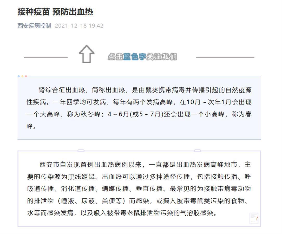 18日當天,西安疾控中心以及多家當地醫院發布了“防治出血熱”的相關文章,提醒市民做好預防,并及早介入治療。