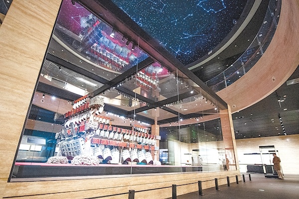 “曾侯乙”展覽是對原館展覽的全新改陳,分為“敬天崇祖”“金聲玉振”“所尚若陳”“觀象授時”“車馬儀仗”“永保用享”等部分,多角度闡釋曾侯乙文物,展現古代禮樂文明,凸顯文物藝術特色。搬進新家的曾侯乙編鐘,成該展最大的亮點。它被陳列在寬敞的玻璃展柜中,處于恒溫恒濕的環境中,享受著高科技的實時守護,與頭頂的“二十八星宿穹頂”相伴,向觀眾訴說著2400年前的傳奇。