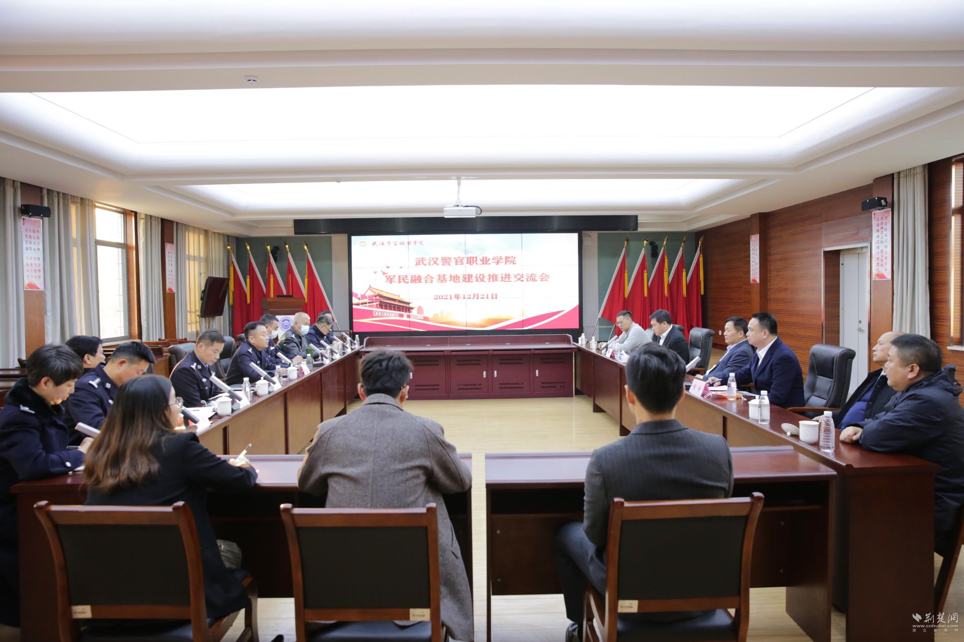 荊楚網(湖北日報網)訊(記者肖慧婷)12月21日,武漢警官職業學院軍民融合基地建設推進交流會在該院召開。中央軍委國防動員部辦公廳原副主任陳瑛、《小康》雜志社常務副社長殷云、力學家(深圳)教育有限公司總經理王彬及武漢警官職業學院全體領導參加座談會。