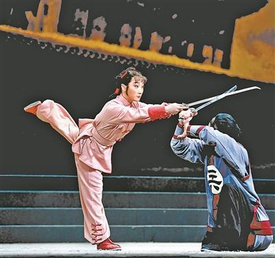 作為近年來京劇舞臺(tái)上難得一見的新創(chuàng)武戲,精彩火爆的武戲場面成為《大刀王五》的最大亮點(diǎn)。該劇將傳統(tǒng)京劇武戲與武術(shù)、舞蹈有機(jī)結(jié)合,劇中所用道具清一色為真刀真槍,對(duì)于演員動(dòng)作的熟練度和技巧性有極高要求。此外,劍、雙手帶、三節(jié)棍等各式兵器均有所展示,凸顯出“武”文化的多樣性。激烈的武戲中,跟頭、竄毛等技巧,單對(duì)、大小蕩子等場面運(yùn)用得當(dāng),高燃熱血的短兵相接、近身搏斗和氣勢磅礴的“大刀舞”,無一不體現(xiàn)出該劇在振興武戲方面所做出的有益探索。