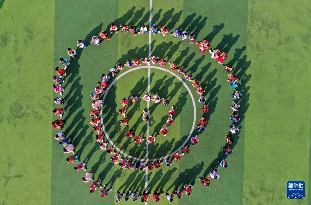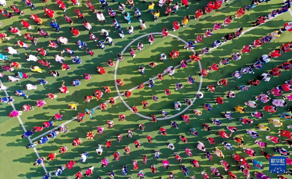 12月23日,在廣西柳州市融安縣實(shí)驗(yàn)小學(xué),學(xué)生們?cè)陉柟獯笳n間活動(dòng)中演奏葫蘆絲(無人機(jī)照片)。