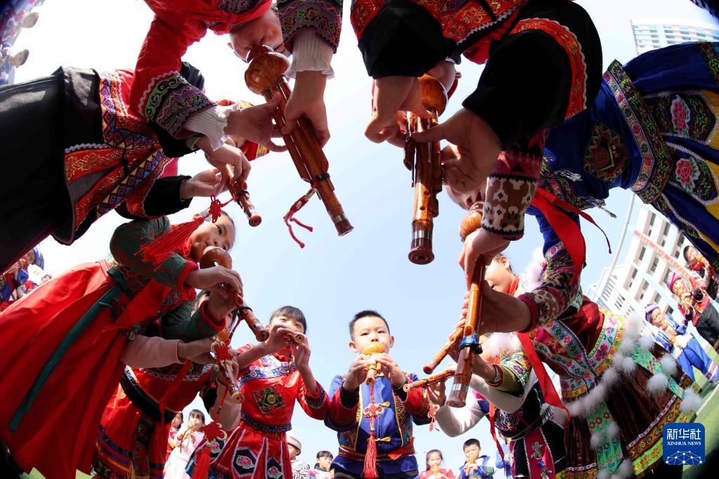 12月23日,在廣西柳州市融安縣實(shí)驗(yàn)小學(xué),學(xué)生們?cè)陉柟獯笳n間活動(dòng)中演奏葫蘆絲。