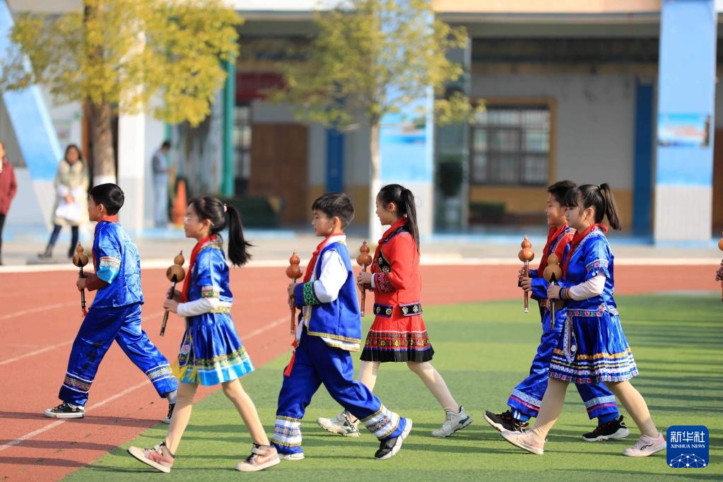 12月23日,在廣西柳州市融安縣實(shí)驗(yàn)小學(xué),學(xué)生們拿著葫蘆絲去參加陽光大課間活動(dòng)。