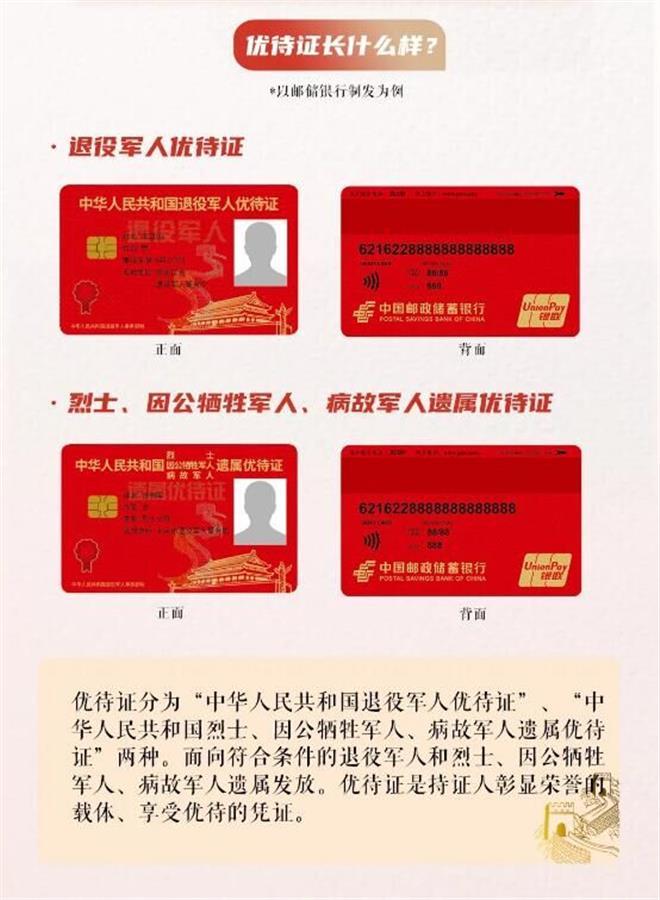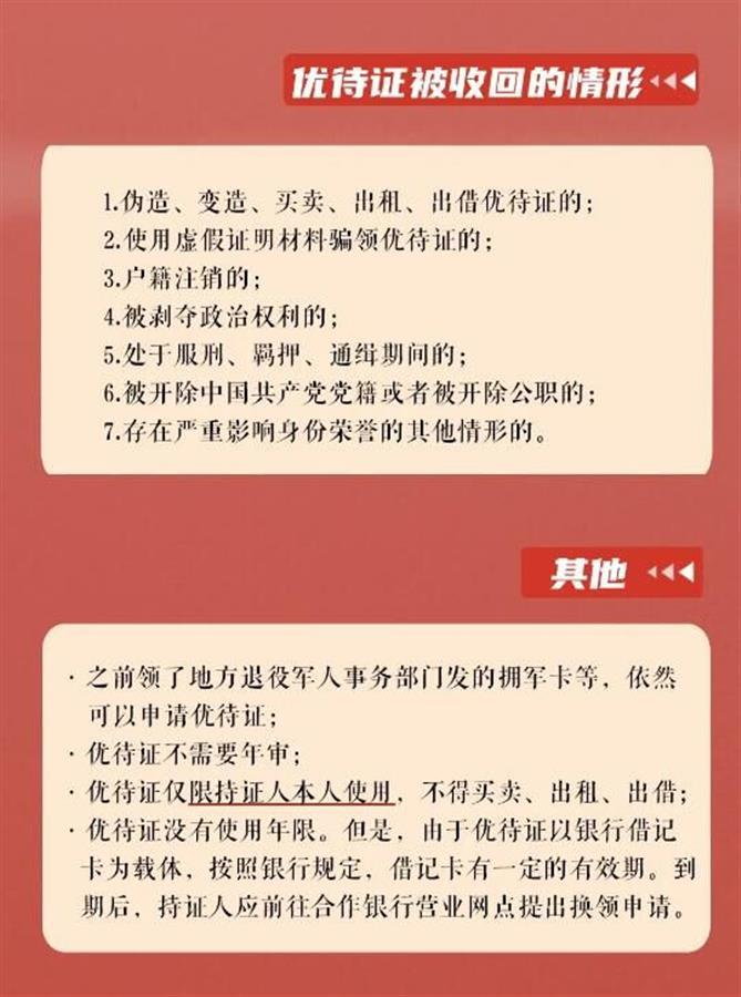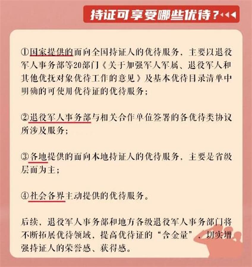 三是各地提供的面向本地或全國持證人的優待服務,比如有的省、市出臺的面向退役軍人的交通、文旅等涉及日常生活的優待。