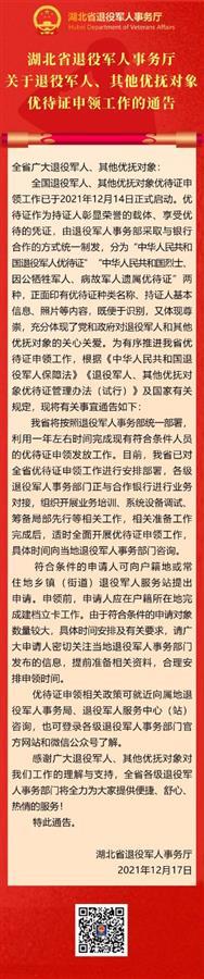 湖北省退役軍人事務廳發布關于退役軍人、其他優撫對象優待證申領工作的通告: