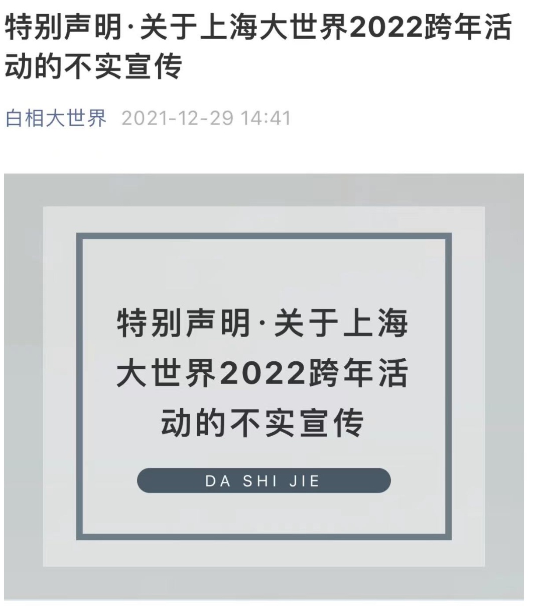 日前,上海大世界發(fā)布消息,就部分社交媒體上對于2022年大世界跨年活動的不實宣傳進行了辟謠和聲明。