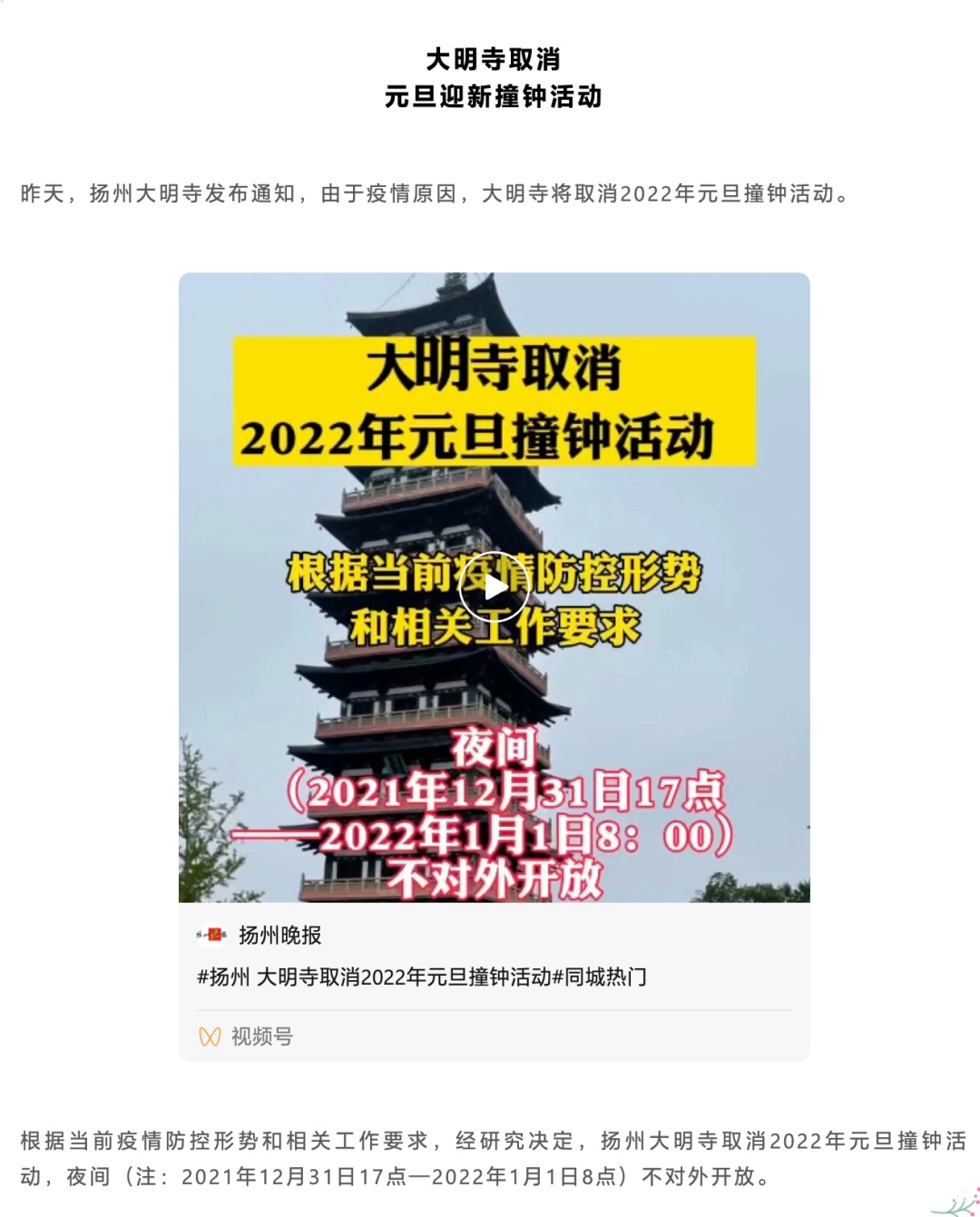 揚州:大明寺取消元旦迎新撞鐘活動