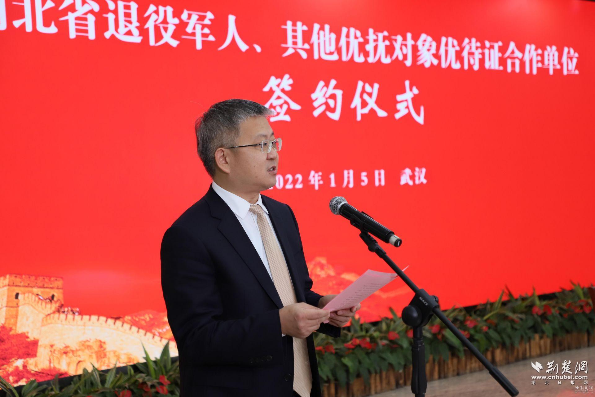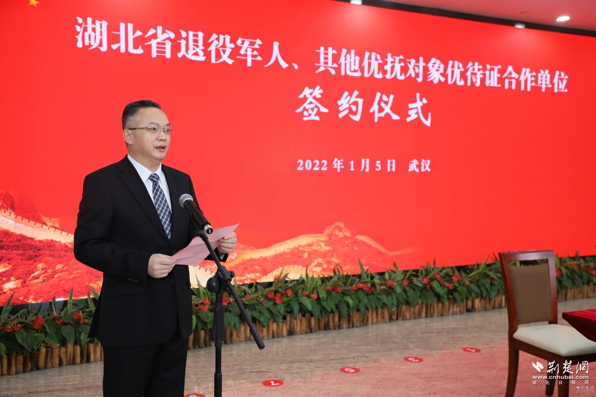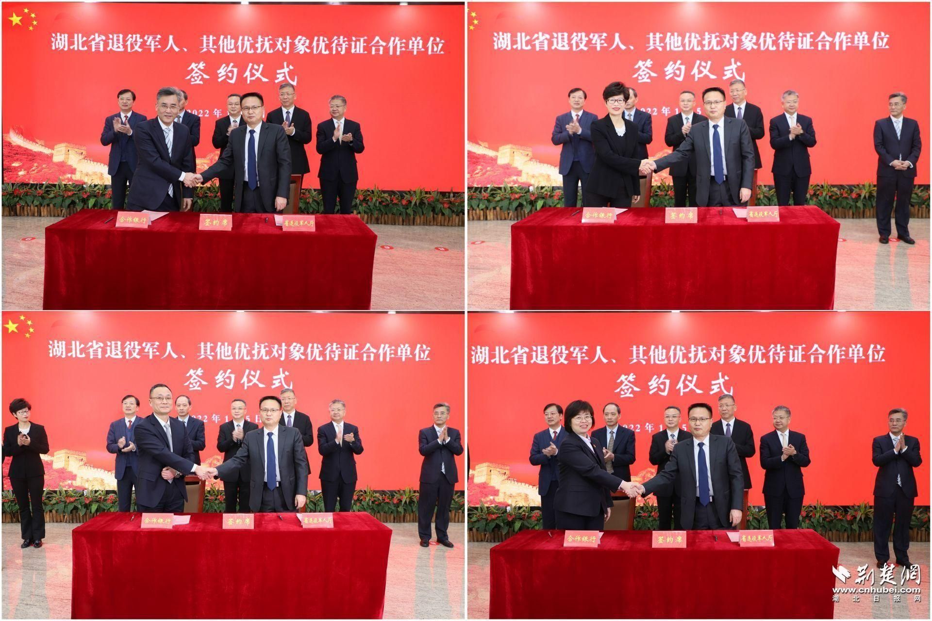 荊楚網(湖北日報網)訊(記者肖慧婷 通訊員包曉霽)根據退役軍人事務部統一部署,1月5日下午,湖北省退役軍人、其他優撫對象優待證合作單位簽約儀式在武漢舉行。省退役軍人事務廳黨組書記、廳長周振武,工商銀行湖北省分行黨委書記、行長郭偉,農業銀行湖北省分行黨委書記、行長陳金焱,郵政儲蓄銀行湖北省分行黨委書記、行長唐華建,光大銀行武漢分行黨委書記、行長譚夢湘出席儀式并致辭。