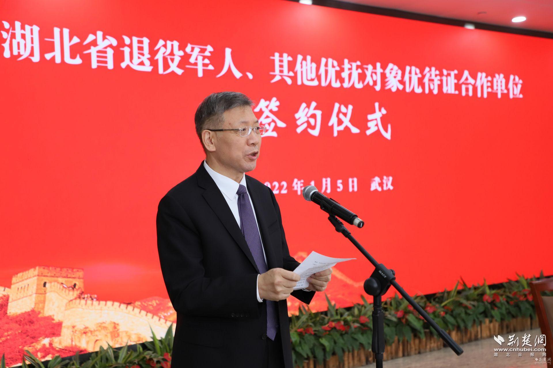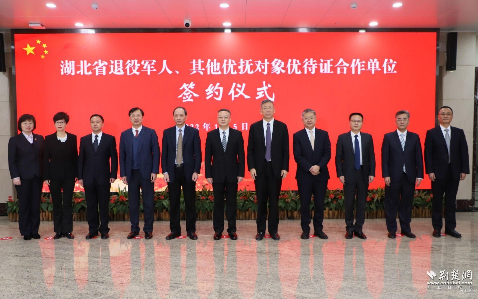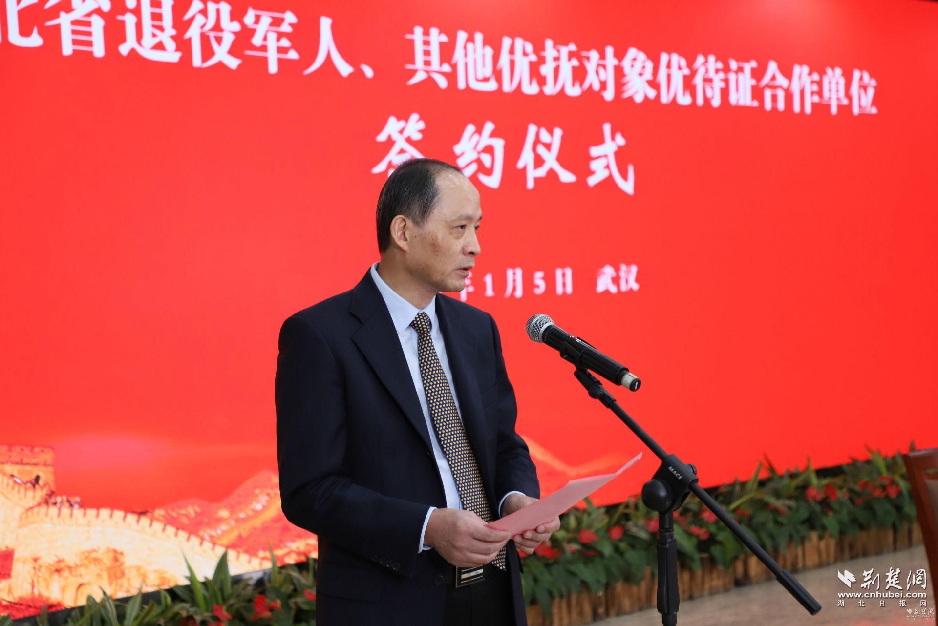 荊楚網(湖北日報網)訊(記者肖慧婷 通訊員包曉霽)根據退役軍人事務部統一部署,1月5日下午,湖北省退役軍人、其他優撫對象優待證合作單位簽約儀式在武漢舉行。省退役軍人事務廳黨組書記、廳長周振武,工商銀行湖北省分行黨委書記、行長郭偉,農業銀行湖北省分行黨委書記、行長陳金焱,郵政儲蓄銀行湖北省分行黨委書記、行長唐華建,光大銀行武漢分行黨委書記、行長譚夢湘出席儀式并致辭。