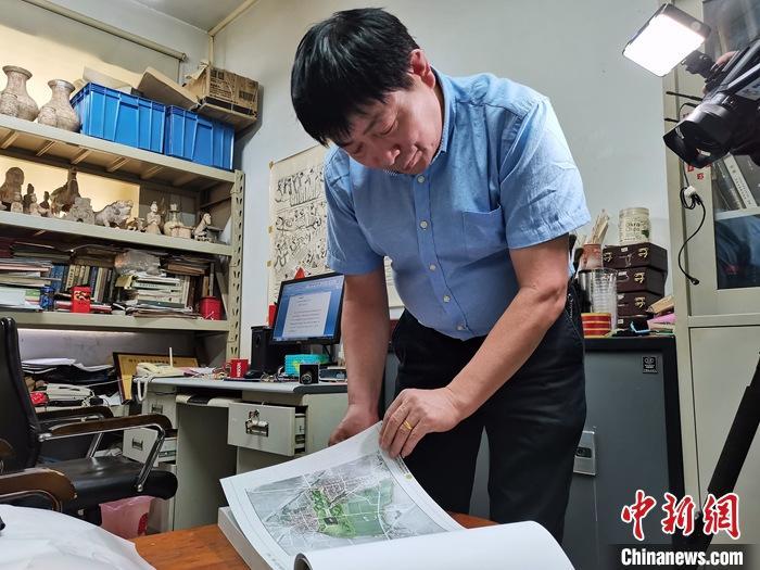 中新社記者專訪時透露,自2008年底對曹操高陵發掘以來,他和團隊主要工作集中在高陵內文物的整理和研究等方面。目前,已修復出970余件曹操墓出土文物,全部修復完成達一千余件。圖為8月14日,河南鄭州,潘偉斌介紹安陽高陵本體保護與展示工程項目規劃設計方案。中新社記者 李貴剛 攝