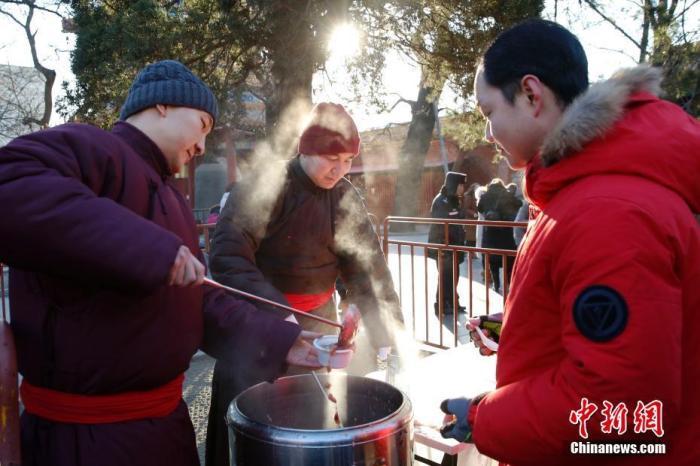 資料圖:臘八節當日,雍和宮的工作人員熬制臘八粥免費發放。中新社記者 韓海丹 攝
