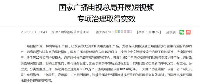 中新網1月11日電 國家廣電總局網站11日刊發消息稱,國家廣播電視總局開展短視頻專項治理取得實效。
