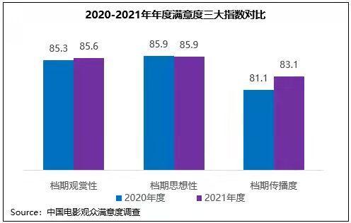 據(jù)了解,從滿意度三大指數(shù)來看,2021年年度觀賞性、思想性得分分別為85.6分、85.9分,較去年穩(wěn)中小漲;年度傳播度得分83.1分,較去年同期增長2分,表明今年觀眾分享傳播的熱情較去年相比有了明顯改觀。