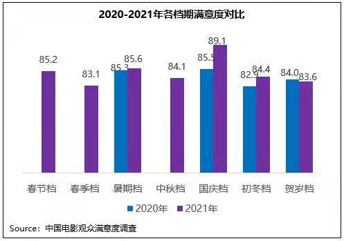 從各檔期來看,與去年同期相比,2021年暑期檔、國慶檔和初冬檔滿意度均同比增長,僅賀歲檔略有下滑。其中2021年國慶檔觀眾滿意度89.1分,為歷史調(diào)查44個檔期的最高分;暑期檔滿意度85.6分,居歷史調(diào)查第4位。年內(nèi)檔期高滿意度有效助力電影市場信心重建。