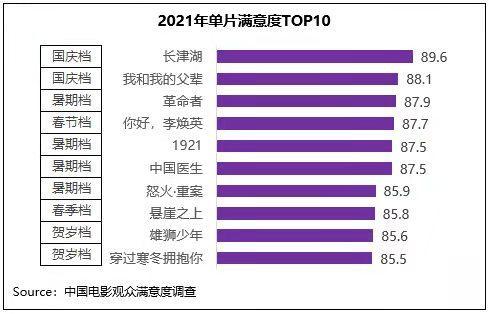 從2021年單片滿意度前十名影片來看,各檔期、各類型均有高滿意度精品產(chǎn)出。向建黨百年獻禮、向時代精神致敬的新主流影片占據(jù)滿意度高位,如國慶檔《長津湖》《我和我的父輩》、暑期檔《革命者》《1921》《中國醫(yī)生》,滿意度均超87分,居年度前十名榜單前列。春節(jié)檔上映的《你好,李煥英》以貼近生活、真情實感與大眾產(chǎn)生強烈共鳴,滿意度居年度第四位;另外,《怒火·重案》《懸崖之上》《雄獅少年》等影片也以較高的類型化創(chuàng)作水平得到了觀眾的高滿意度評價。