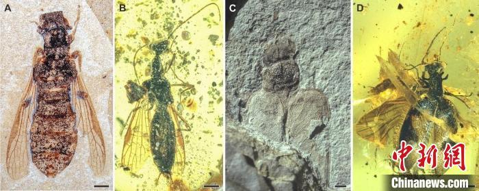 研究人員發(fā)現(xiàn),這類奇翅蟲縮短的前翅類似蜂類的翅基片,后翅的形態(tài)也很接近蜂類的翅膀;尤其是身體的形狀和大小非常接近緬甸琥珀中的長背泥蜂。這表明這類奇翅蟲很可能具有擬態(tài)蜂類的行為,這也是目前化石中最古老蜂類擬態(tài)行為的證據(jù)。
