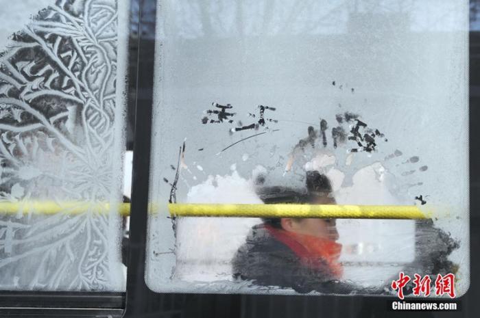 資料圖:一位女乘客坐在凝結(jié)出冰花的車窗旁,當(dāng)日是大寒節(jié)氣。中新社記者 孫昊聲 攝