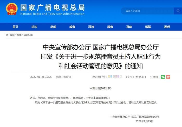 中新網1月26日電 據國家廣電總局網站消息,近日,中央宣傳部辦公廳、國家廣播電視總局辦公廳聯合發布《關于進一步規范播音員主持人職業行為和社會活動管理的意見》。其中提到,各級宣傳部門、廣播電視行政部門、播出機構要教育引導播音員主持人,自覺抵制名利誘惑和低俗庸俗媚俗,凈化“交際圈”“朋友圈”。
