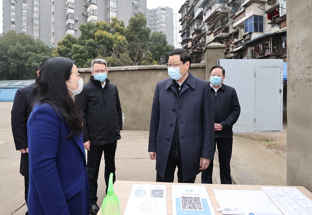 武昌區(qū)紫陽街道歌笛湖社區(qū)大歌笛湖小區(qū)入口,社區(qū)常態(tài)化疫情防控工作人員正在值守。應(yīng)勇走上前,向他們表示親切慰問,查看近期返漢人員登記情況等。